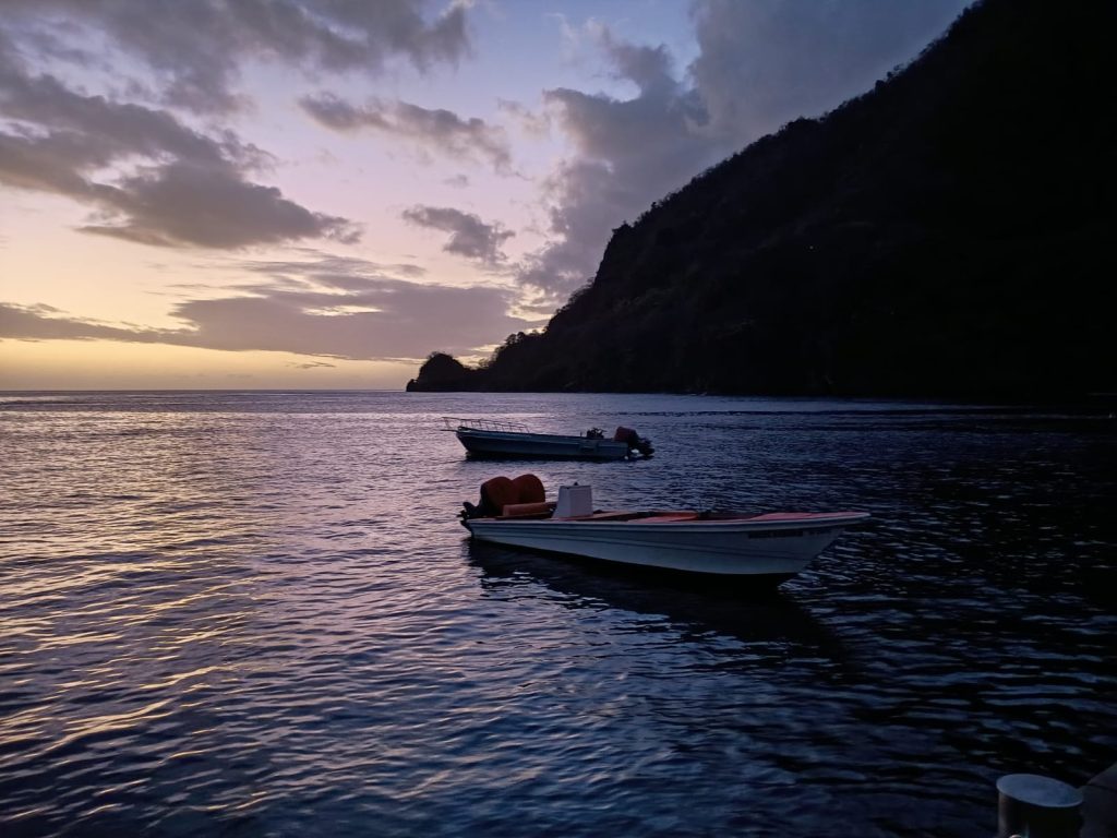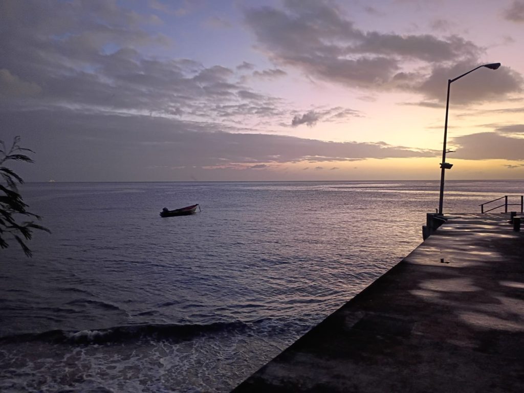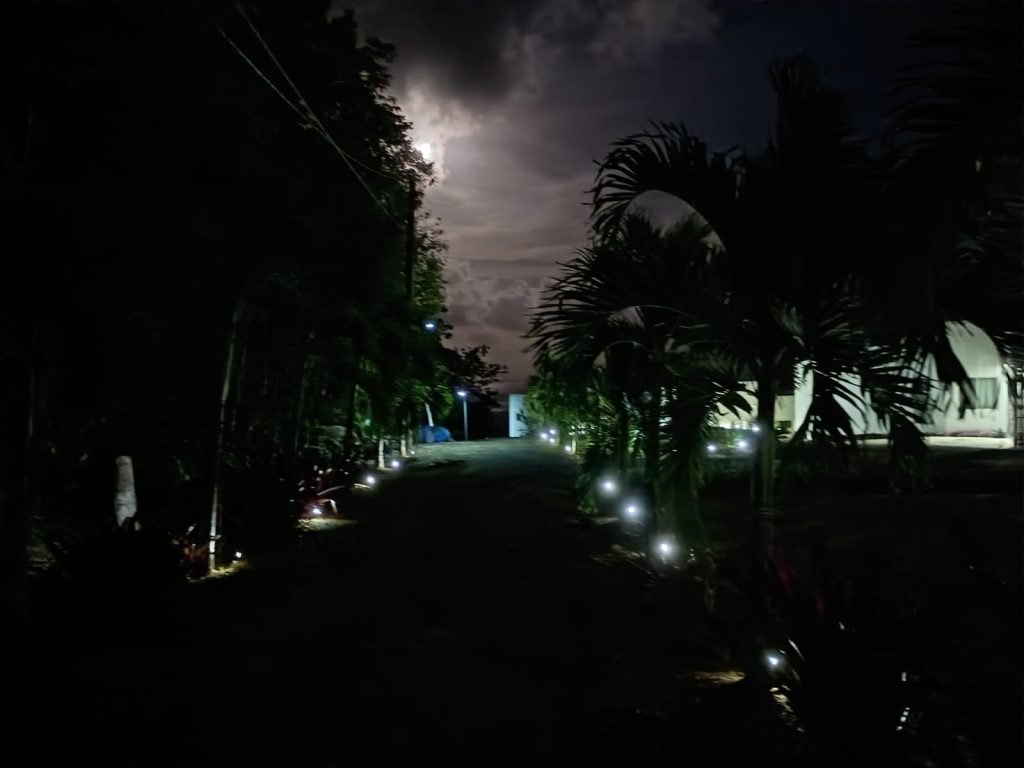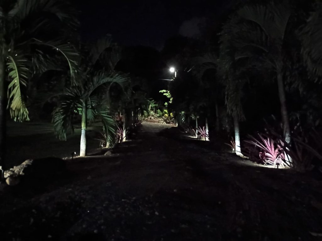 Ancient stone ruins with arched doorway leading to the sea and palm trees